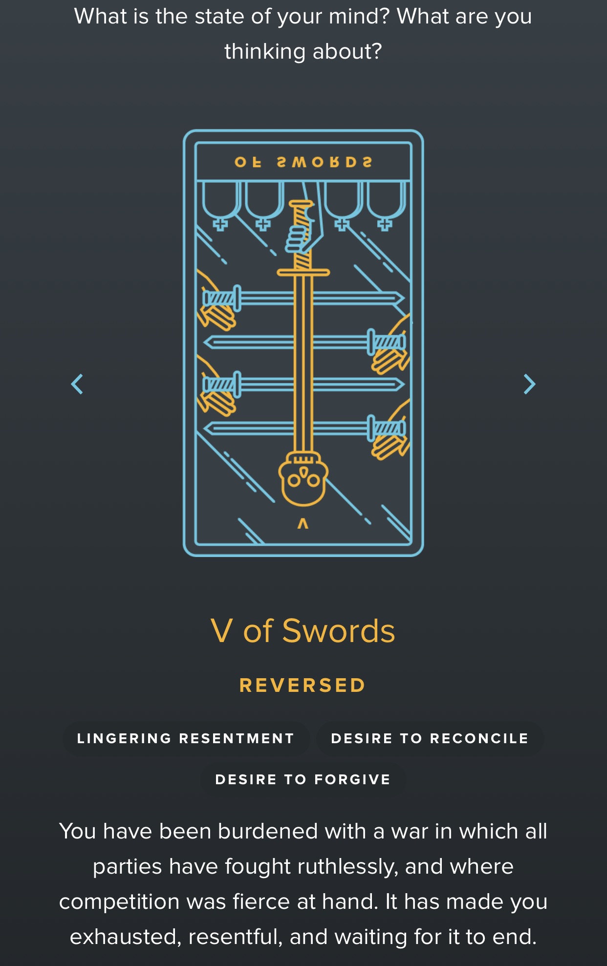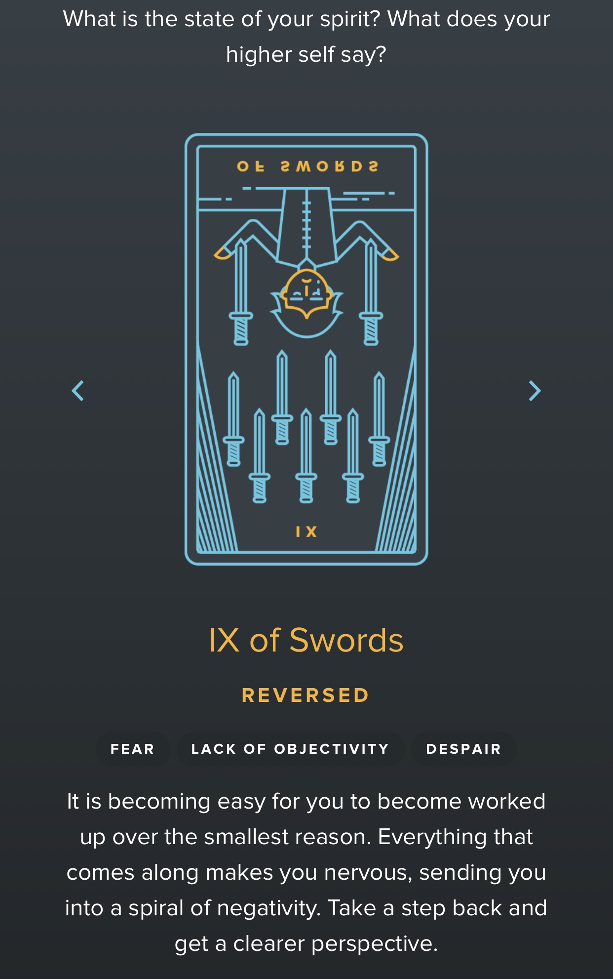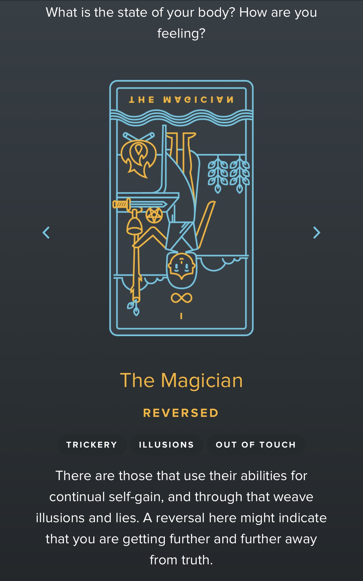 I decided to give the tarot bit a try, and so I did a quick reading using The Golden Thread Tarot app, which I highly recommend in no small part because the cards are illustrated in a lovely fashion, and the explanations for them are succinct and detailed. Since I have been struggling with how I feel in mind, body, and spirit, that’s the reading I did, and these are the results I got.